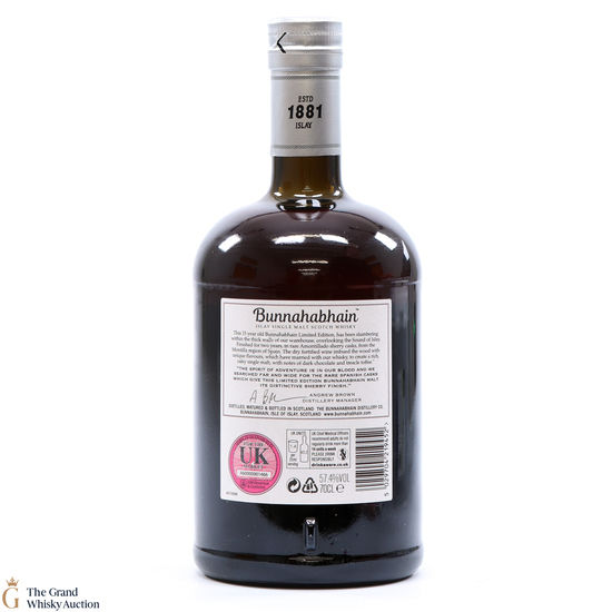 This is a 2019 distillery exclusive from Bunnahabhain Distillery. This Amontillado Cask Finish limited edition started life on the 20th of February 2003 in refill hogsheads before being transferred to Amontillado sherry hogsheads on the 26th of February 2016 where it spent two more years maturing in Bunnahabhain's coastal warehouses.