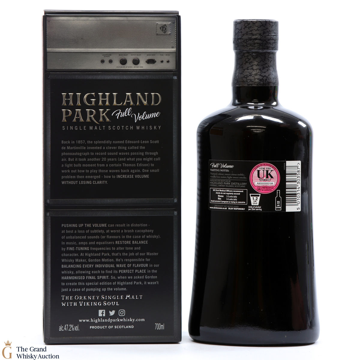 Full Volume by Highland Park was distilled in 1999 and bottled in 2017 from 481 casks. The single malt was matured exclusively in first-fill bourbon casks and was bottled at 47.2% ABV and comes presented in a themed presentation box resembling speaker.