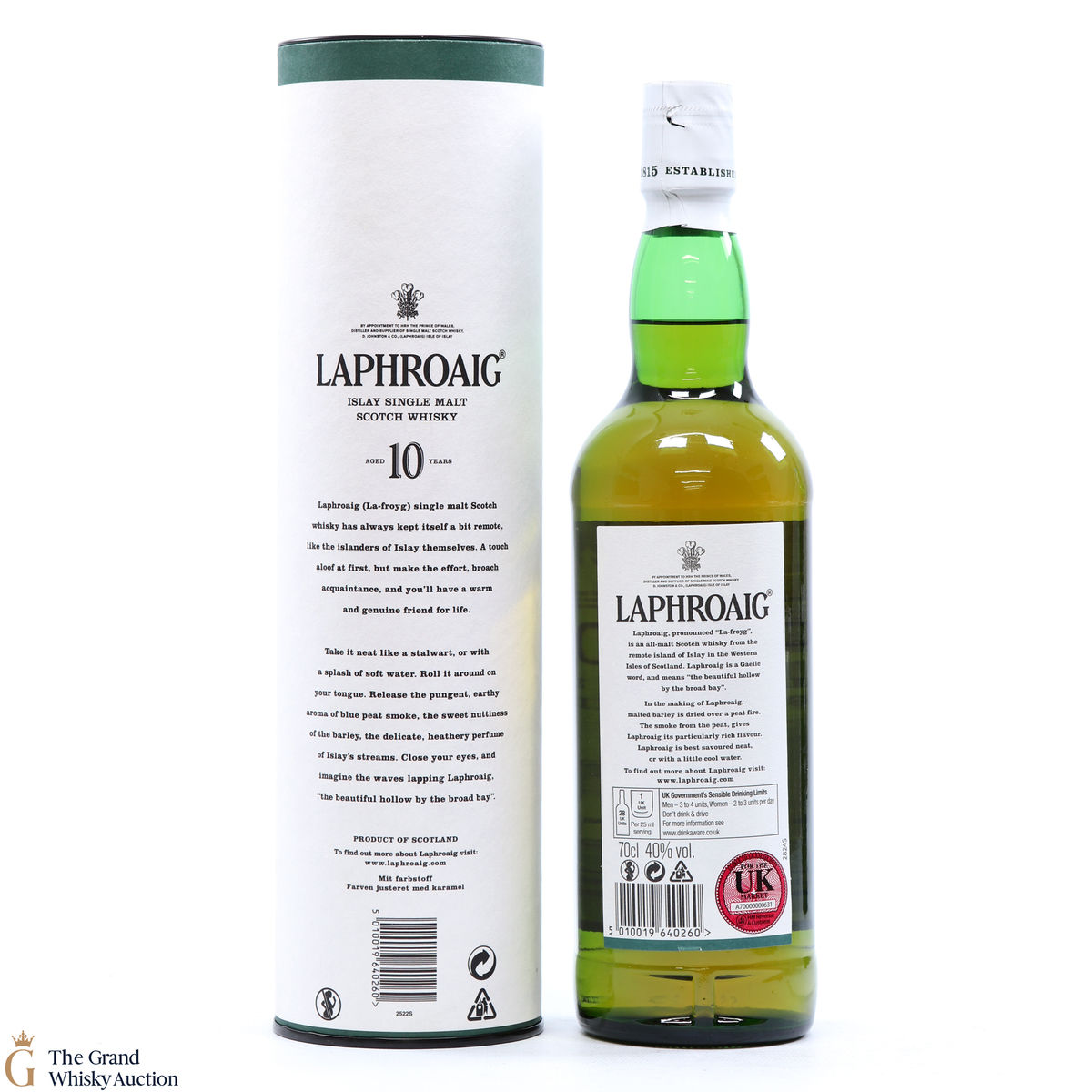 A 70cl of the medicinal 10 year old from Islay's bestselling distillery, Laphroaig. In making Laphroaig, malted barley is dried over a peat fire. The smoke from this peat, found only on Islay, gives Laphroaig its particularly rich flavour.