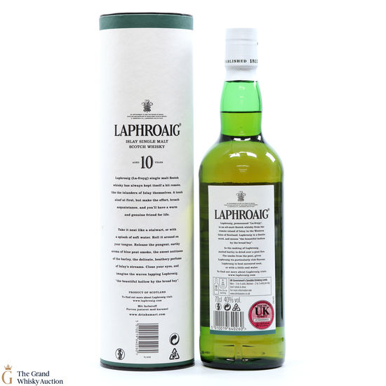 A 70cl of the medicinal 10 year old from Islay's bestselling distillery, Laphroaig. In making Laphroaig, malted barley is dried over a peat fire. The smoke from this peat, found only on Islay, gives Laphroaig its particularly rich flavour.