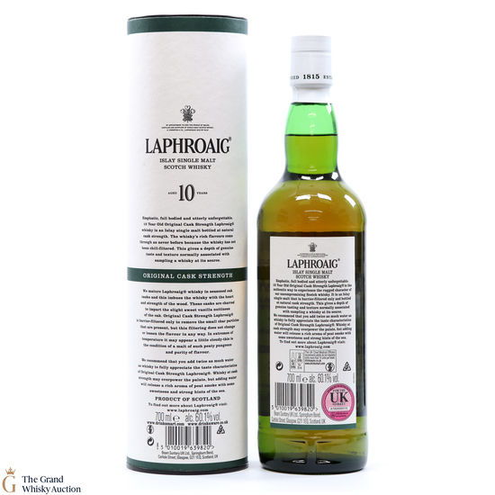This bottling is from batch 012, original cask strength bottling of the medicinal 10 year old from Islay's bestselling distillery, Laphroaig. In making Laphroaig, malted barley is dried over a peat fire. The smoke from this peat, found only on Islay, gives Laphroaig its particularly rich flavour. This release was bottled at 60.1% in February 2020.