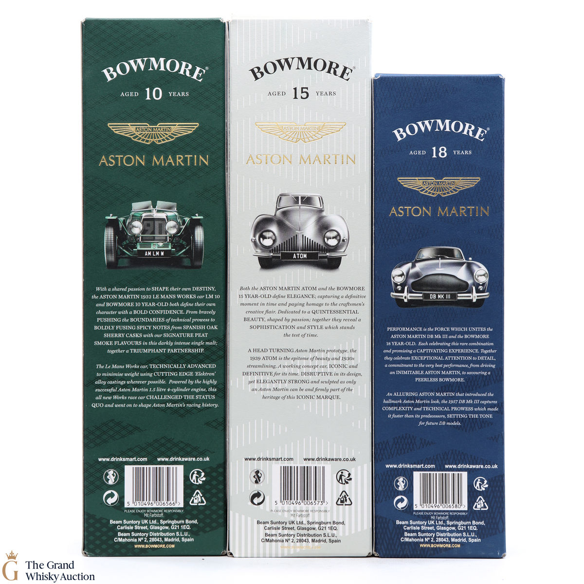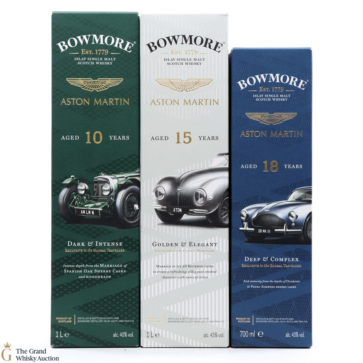 The full collection of the collaboration between Bowmore and Aston Martin, both creating timeless beauty and a lasting legacy. Each edition of the Aston Martin collection features a different car. Included in this lot is edition 1, 2 and 3: