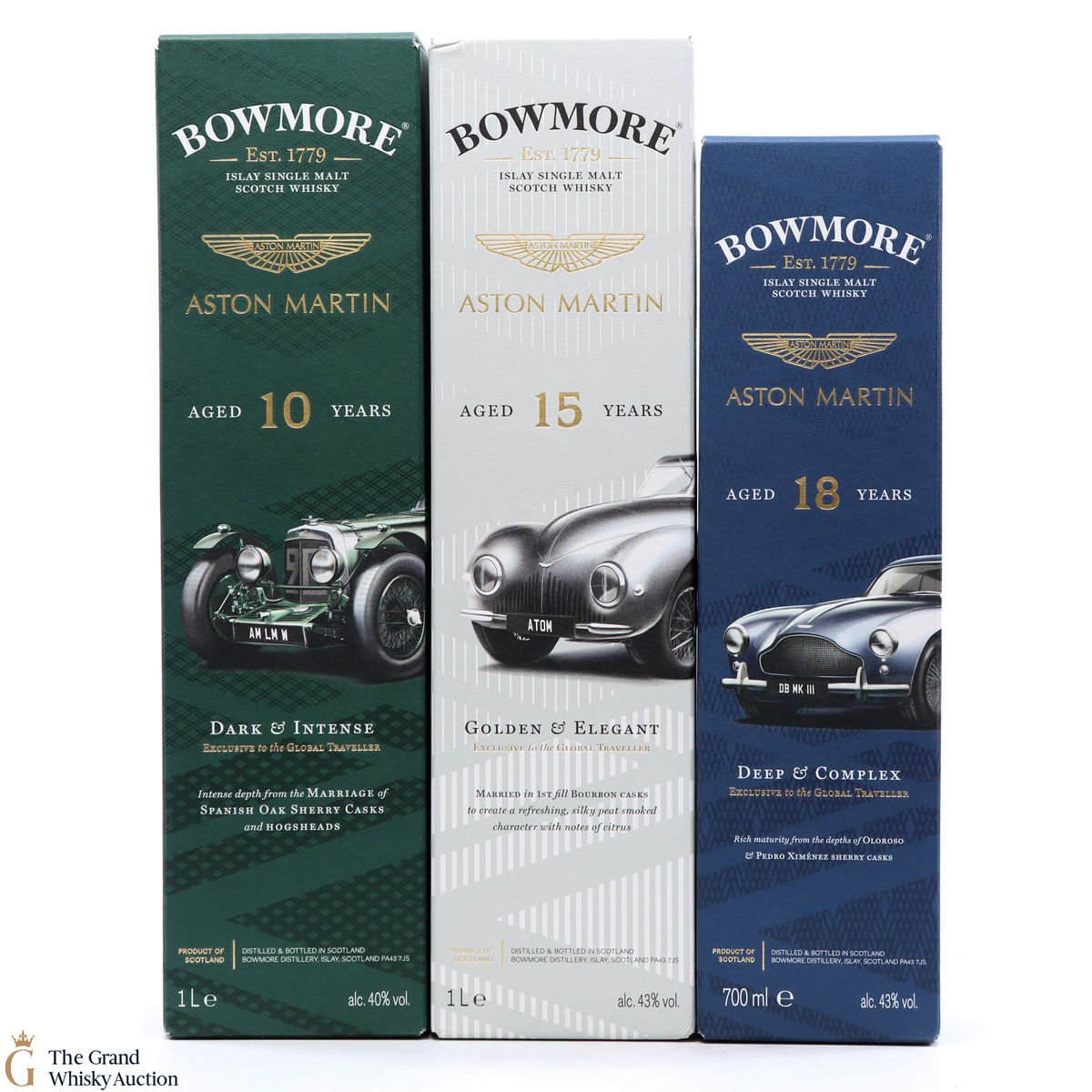 The full collection of the collaboration between Bowmore and Aston Martin, both creating timeless beauty and a lasting legacy. Each edition of the Aston Martin collection features a different car. Included in this lot is edition 1, 2 and 3: