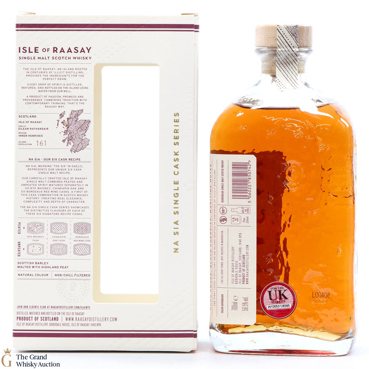 This fantastic single malt from the Isle of Raasay Distillery is the first in their single cask series - Na Sia. Matured in a peated ex-bordeaux wine cask, this spirit was created to show the distinctive styles and characteristics of the 6 Isle of Raasay single malt recipe casks. Bottled at 59.5% ABV.