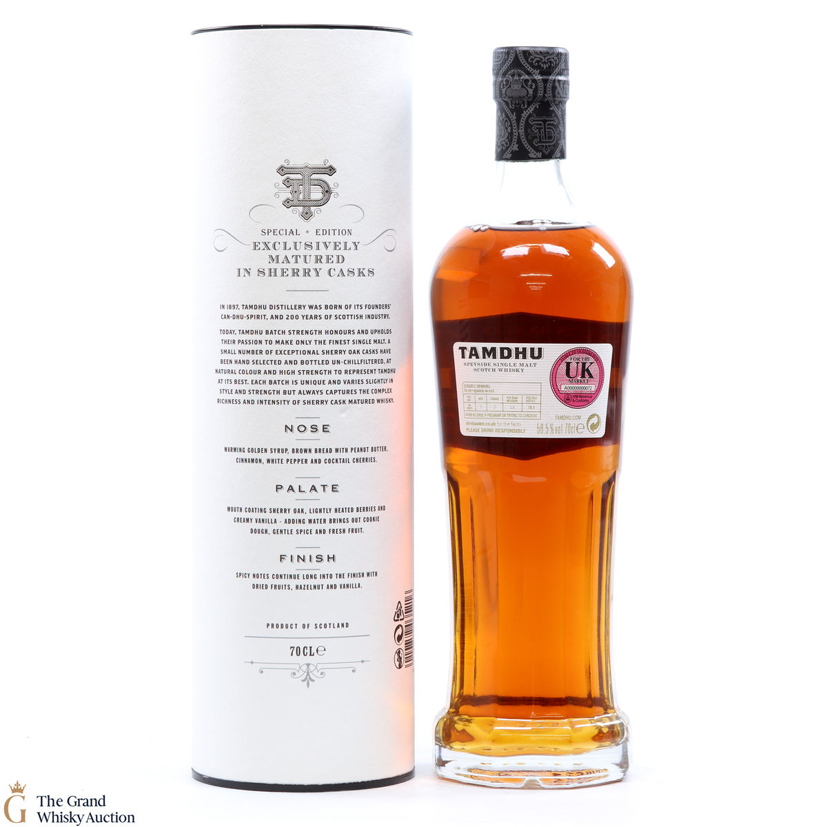 This lot includes 70cl of Tamdhu Speyside Single Malt Scotch Whisky; Batch 2 of the annual edition of Tamdhu's multi-award-winning Batch Strength series. The series reflects Tamdhu’s commitment to producing ‘only the best’ sherry cask matured whisky.
