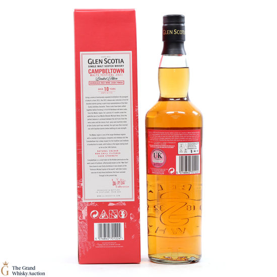 Distilled at Glen Scotia distillery, this limited edition malt was matured in 100% first fill bourbon barrels before being finished in Bourdeaux red wine casks. This bottling was specifically for the Campbeltown Malt Festival 2021 and is the first unpeated release.