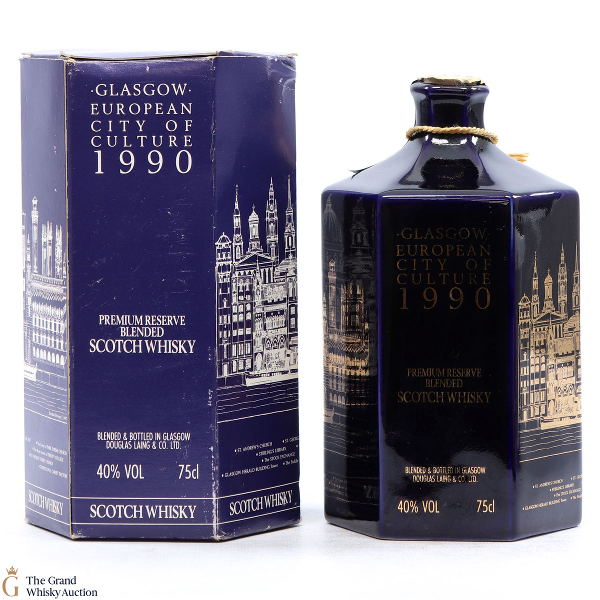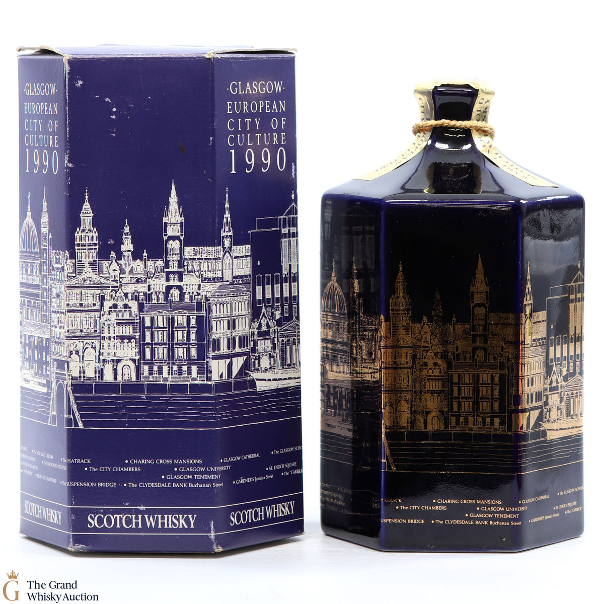 A very collectable decanter by Douglas Laing with illustrations of famous Glasgow landmarks in gold to celebrate Glasgow being bestowed the title of the European City of Culture in 1990.