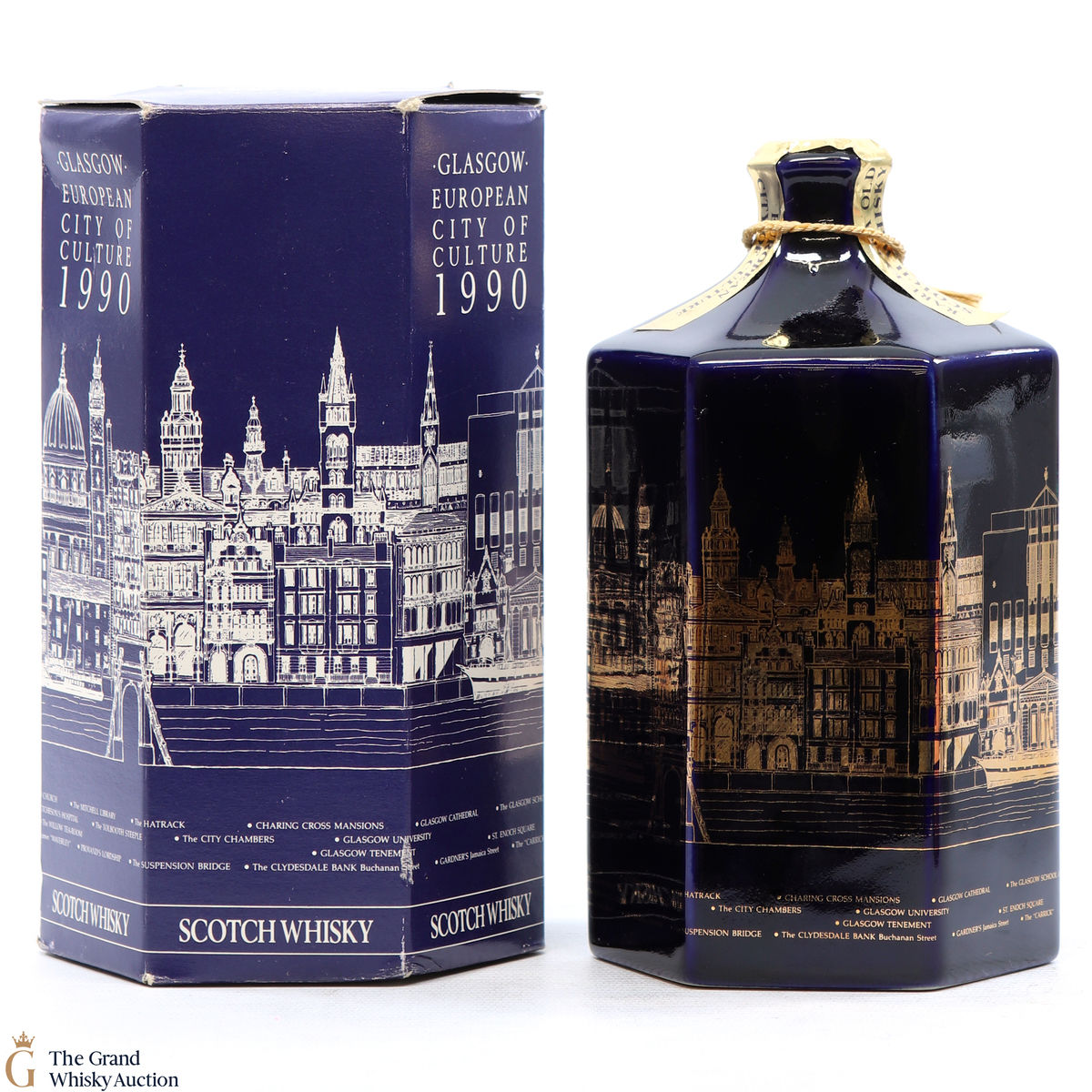 A very collectable decanter by Douglas Laing with illustrations of famous Glasgow landmarks in gold to celebrate Glasgow being bestowed the title of the European City of Culture in 1990.