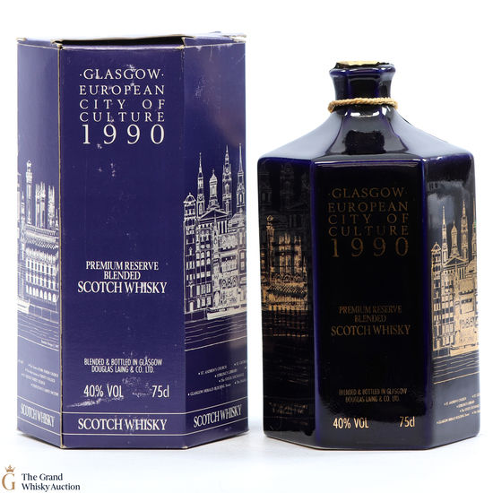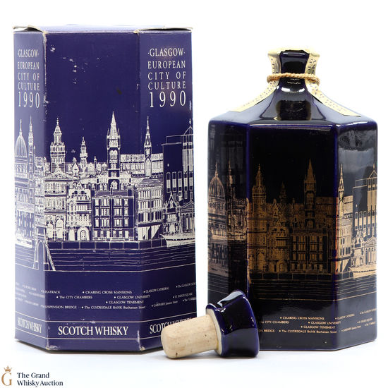 A very collectable decanter by Douglas Laing with illustrations of famous Glasgow landmarks in gold to celebrate Glasgow being bestowed the title of the European City of Culture in 1990.