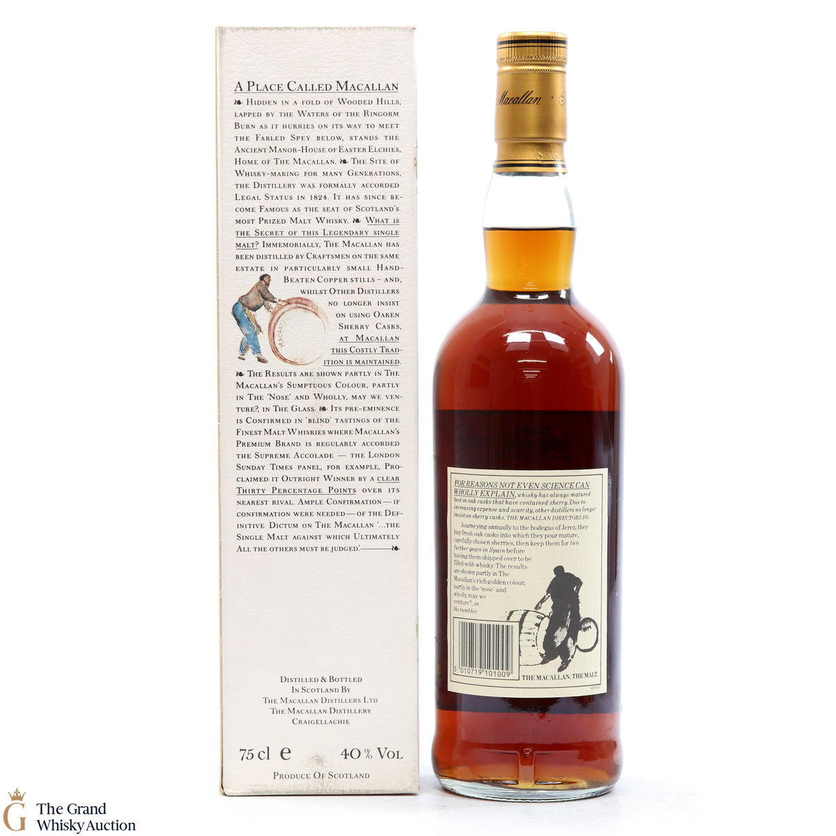 This is an older style of bottling of the famous Macallan 10-year-old malt whisky. It comes presented in the all-white box showing Easter Elchies House, which is increasingly hard to find. This malt was matured in sherry wood.