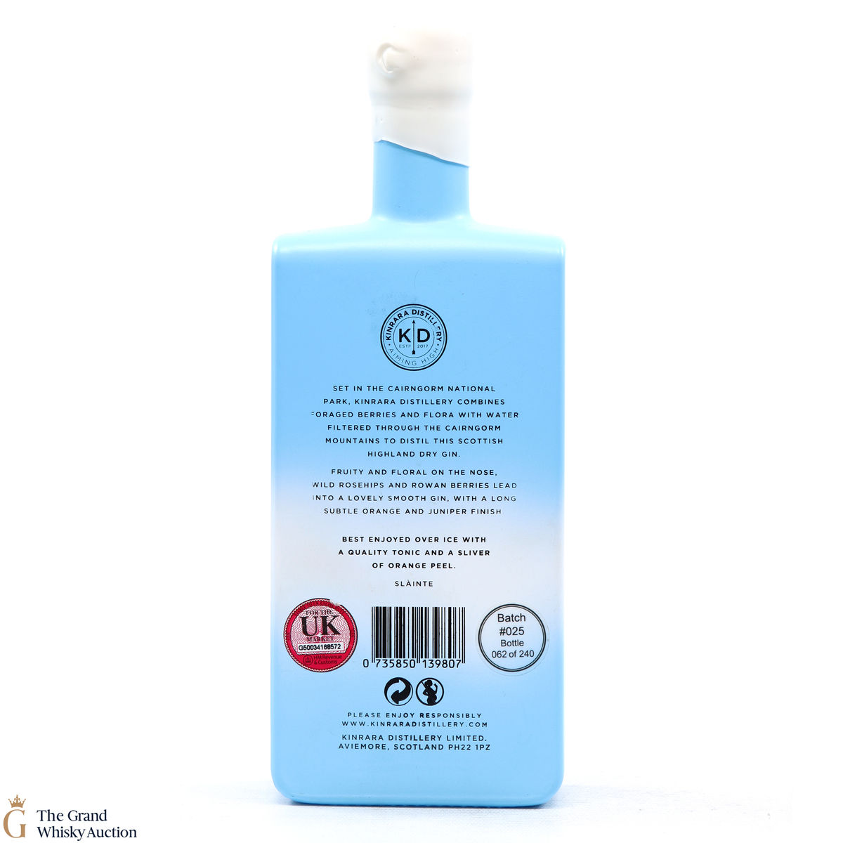 Distilled in the Cairngorm National Park, The Kinrara gin is fruity and floral on the nose. A lovely smooth taste with hints of orange and juniper. This is batch 25 from the distillery which yielded 240 bottles. Bottled at 41.5% ABV.