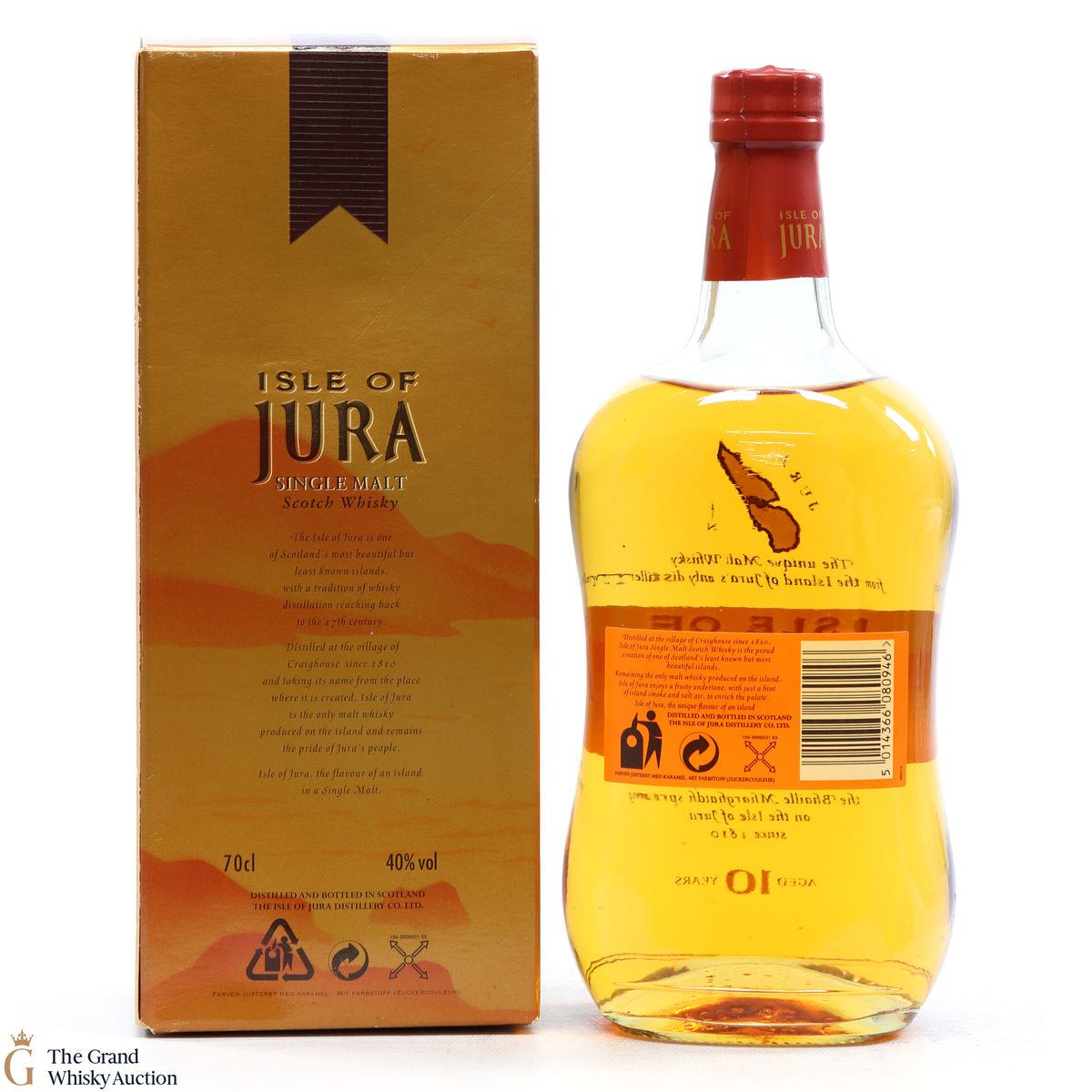 A bottle of Jura 10 Year Old. Originally built in 1810, the distillery fell into disrepair and wasn't revived until the 1960's by two local estate owners.