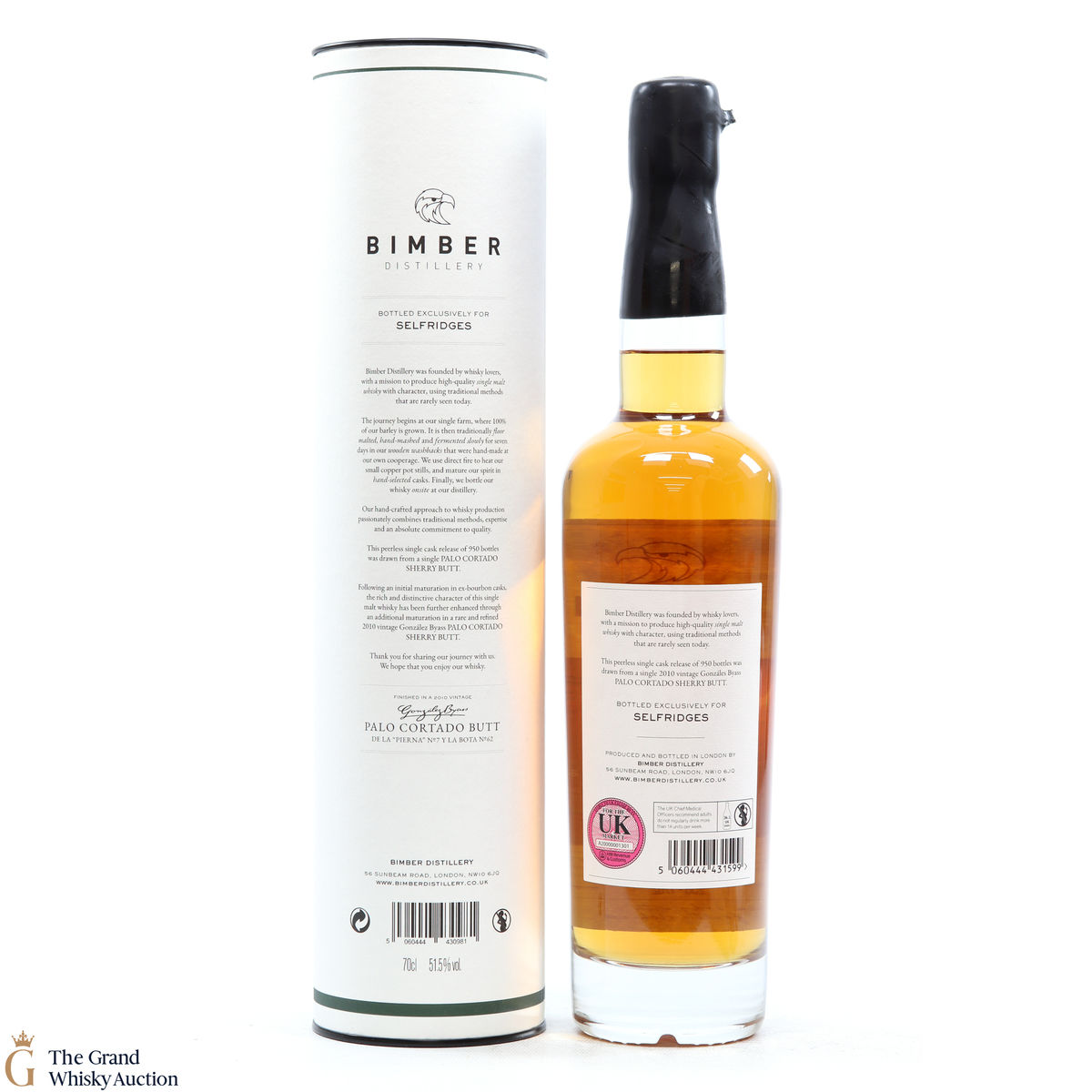 An exclusive partnership between the London distillery and department store Selfridges. This Bimber was made from single farm barley (which was malted at Westminster Maltings) and matured in a single Palo Cortado butt.