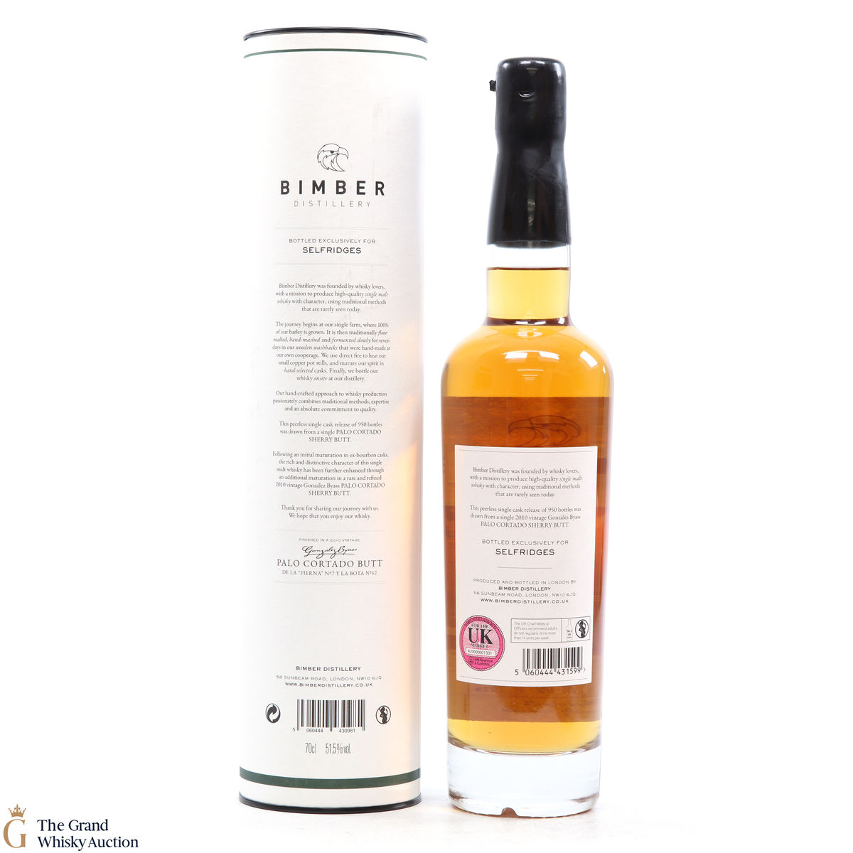 An exclusive partnership between the London distillery and department store Selfridges. This Bimber was made from single farm barley (which was malted at Westminster Maltings) and matured in a single Palo Cortado butt.