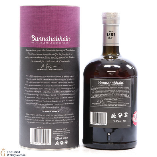 'Mòine' meaning peated in Gaelic - this release brings together both peat smoke and a richly flavoured red-wine cask. This limited release was fully matured in red wine casks from Bordeaux. Distilled in 2008 and matured for 9 years in warehouse No.8. This is one of 4536 individually numbered bottles.