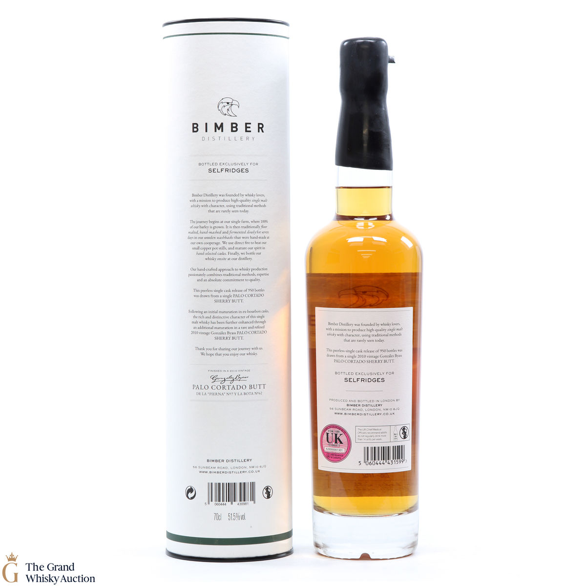 An exclusive partnership between the London distillery and department store Selfridges. This Bimber was made from single farm barley (which was malted at Westminster Maltings) and matured in a single Palo Cortado butt.
