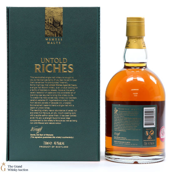 This handcrafted single malt is brought to you by the Wemyss family. Distilled at Bunnahabhain distillery, the Untold Riches 28 Year Old is a single malt held in hogsheads and sherry butts from several parcels of decades old, unpeated Bunnahabhain casks.