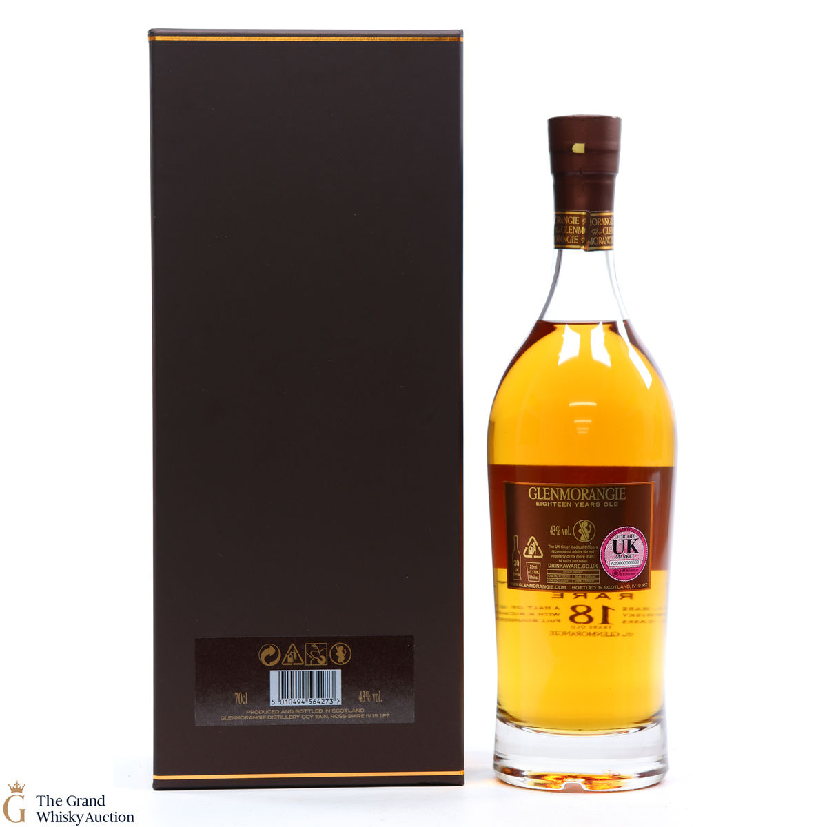 This bottle is an 18-year-old Extremely Rare, Highland single malt produced by Glenmorangie. It has been perfected by the sixteen men of Tain who have specially aged this bottle for 18 years in superior oak casks.