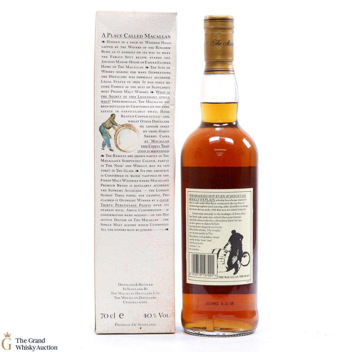 This is an older style of bottling of the famous Macallan 10-year-old malt whisky. It comes presented in the all-white box showing Easter Elchies House, which is increasingly hard to find. This malt was matured in sherry wood.