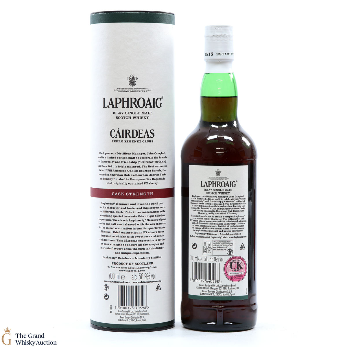 The 2021 edition of Laphroaigs Cairdeas series was first matured in a 1st fill American oak ex-bourbon barrel, then in an American oak ex-bourbon quarter cask before finally being finished in European PX sherry casks. Bottled at the cask strength of 58.9% ABV in 2021 to celebrate the Friends of Laphroaig.