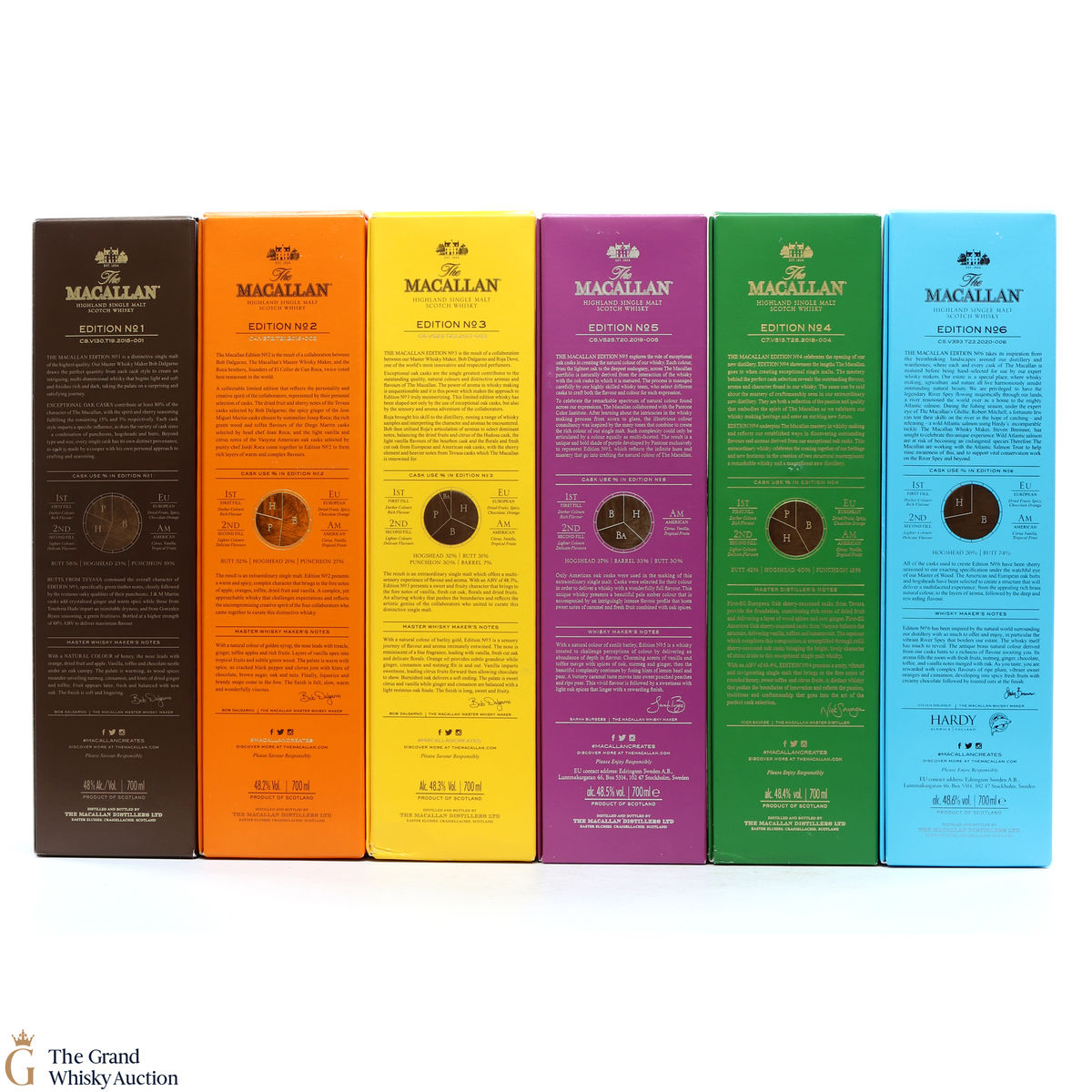 This lot brings together the Macallan Edition set to date, comprising of Edition no. 1, 2, 3 4, 5 & 6 in the annual limited edition series.