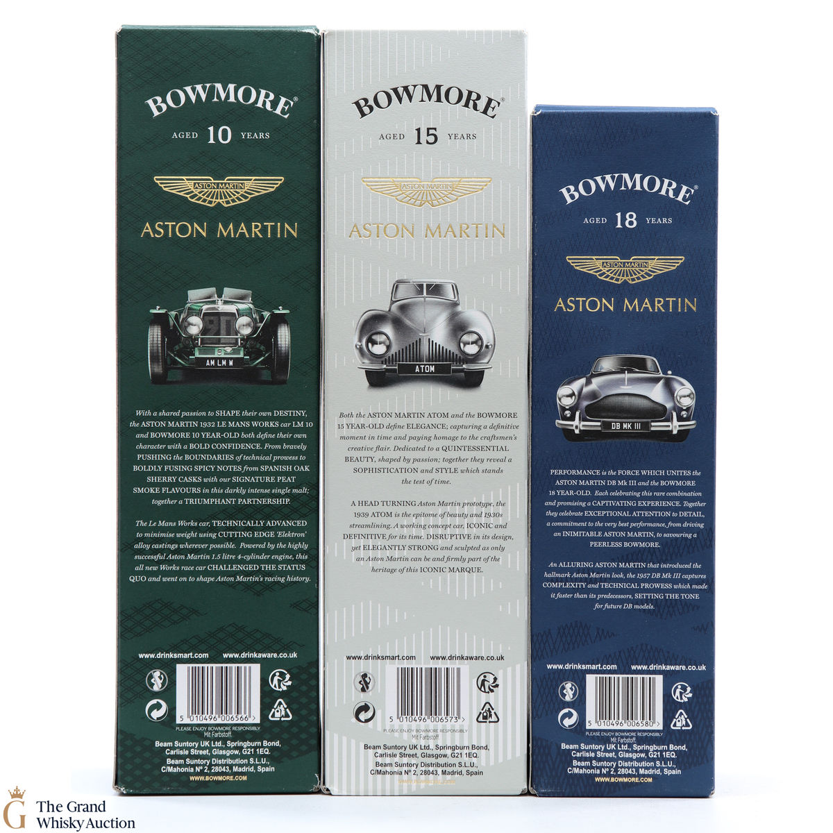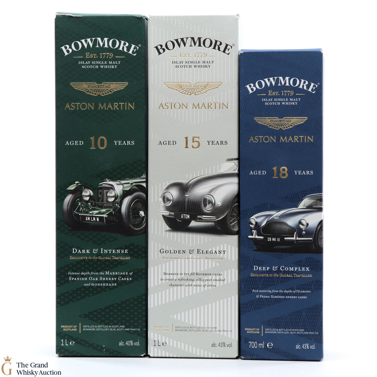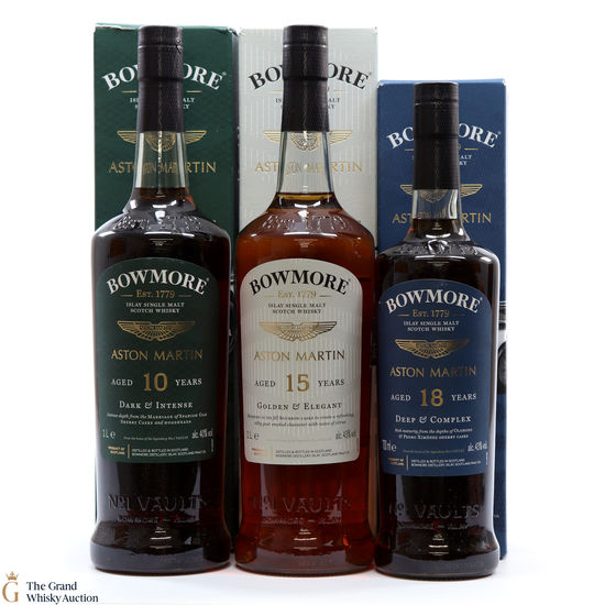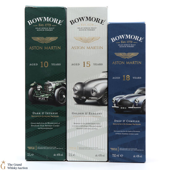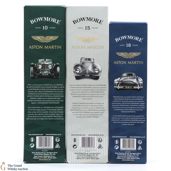 The full collection of the collaboration between Bowmore and Aston Martin, both creating timeless beauty and a lasting legacy. Each edition of the Aston Martin collection features a different car. Included in this lot is edition 1, 2 and 3: