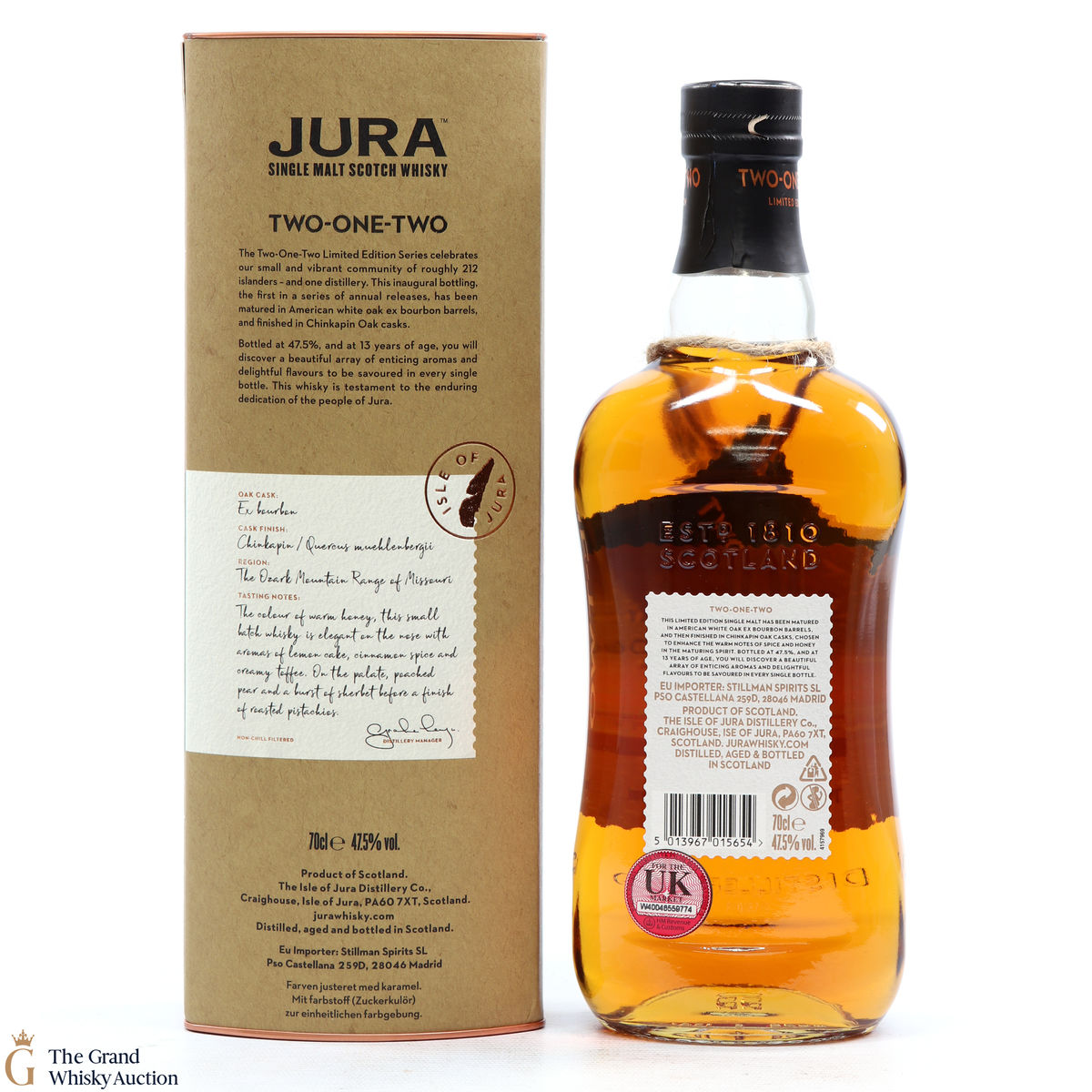 The Two-One-Two Limited Edition Series celebrates the small and vibrant community of roughly 212 Jura islanders – and one distillery. This inaugural bottling, the first in a series of annual releases, has been matured in American White Oak ex-bourbon barrels and finished in Chinkapin Oak casks. Bottled at 47.5%, and at 13 years of age