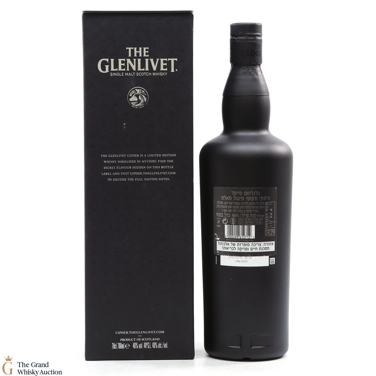 A limited-edition single malt whisky from The Glenlivet's Master Distiller, Alan Winchester. The Glenlivet Cipher comes in an opaque black bottle without cask information, tasting notes and age statement. This bottle is surrounded by mystery. You are encouraged to find the secret flavour hidden on the bottle label and visit the Cipher website for full tasting notes.