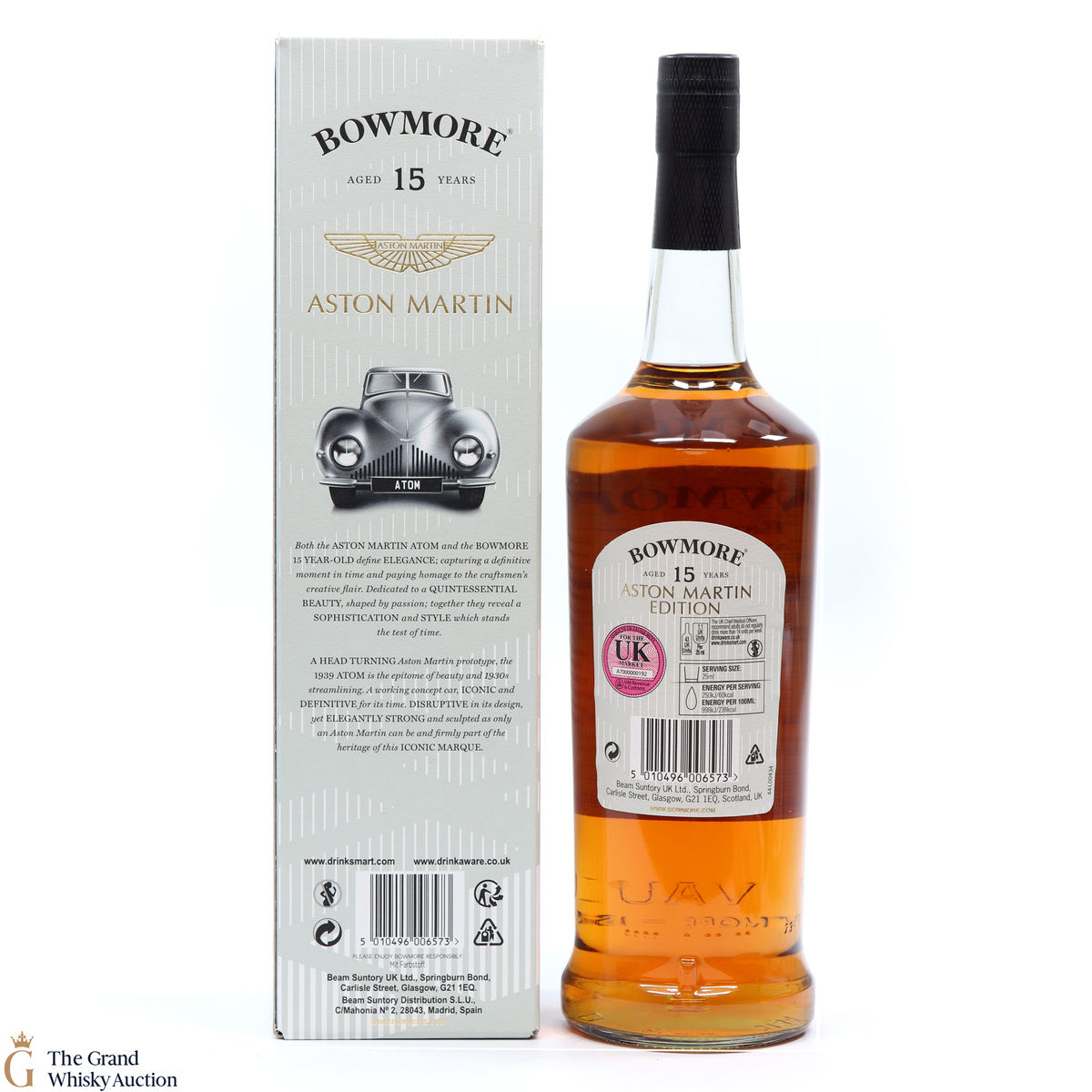 Distilled at the Bowmore Distillery in Islay, this 15 year old single malt was married in first fill bourbon casks. This is the first edition bottling to celebrate the collaboration with Aston Martin, named Dark and Intense it is available exclusively to global travellers. Each of the three editions of the Aston Martin Series features a different car, the 15 has the ATOM.
