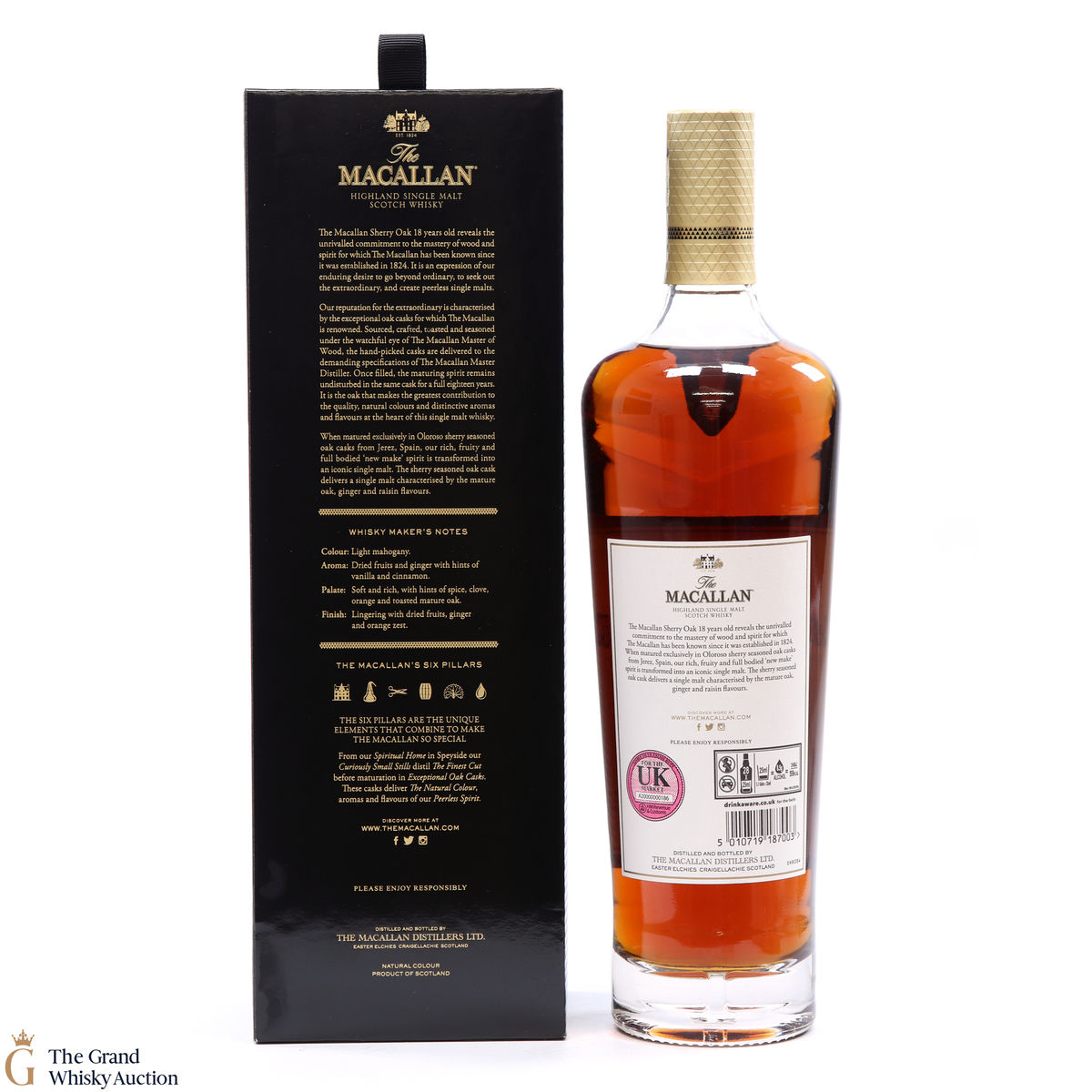 This annual release of The Macallan's popular 18 Year Old Sherry Oak is matured exclusively in sherry seasoned casks, built from both Spanish and American oak, providing a beautifully dark flavour with rich aromas.