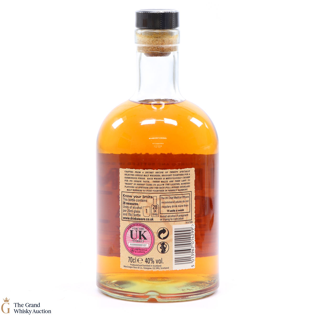 Produced and bottled by MacGregor and Ross in Glasgow, this is a blended malt whisky. This secret recipe has 20 different secret single malt whiskies within.