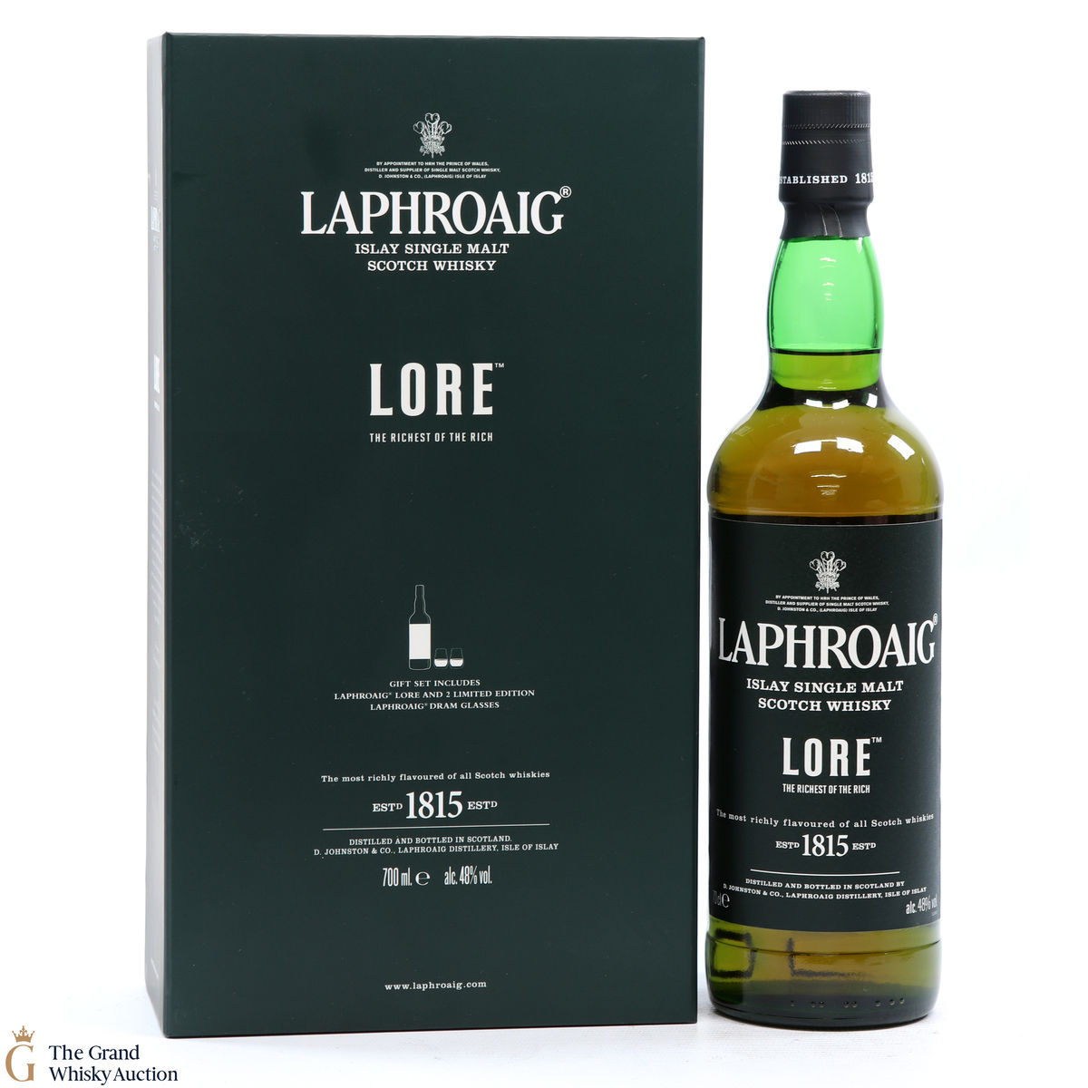 Included in this lot is 1 x 70cl Laphroaig Lore and 2 x dram glasses.