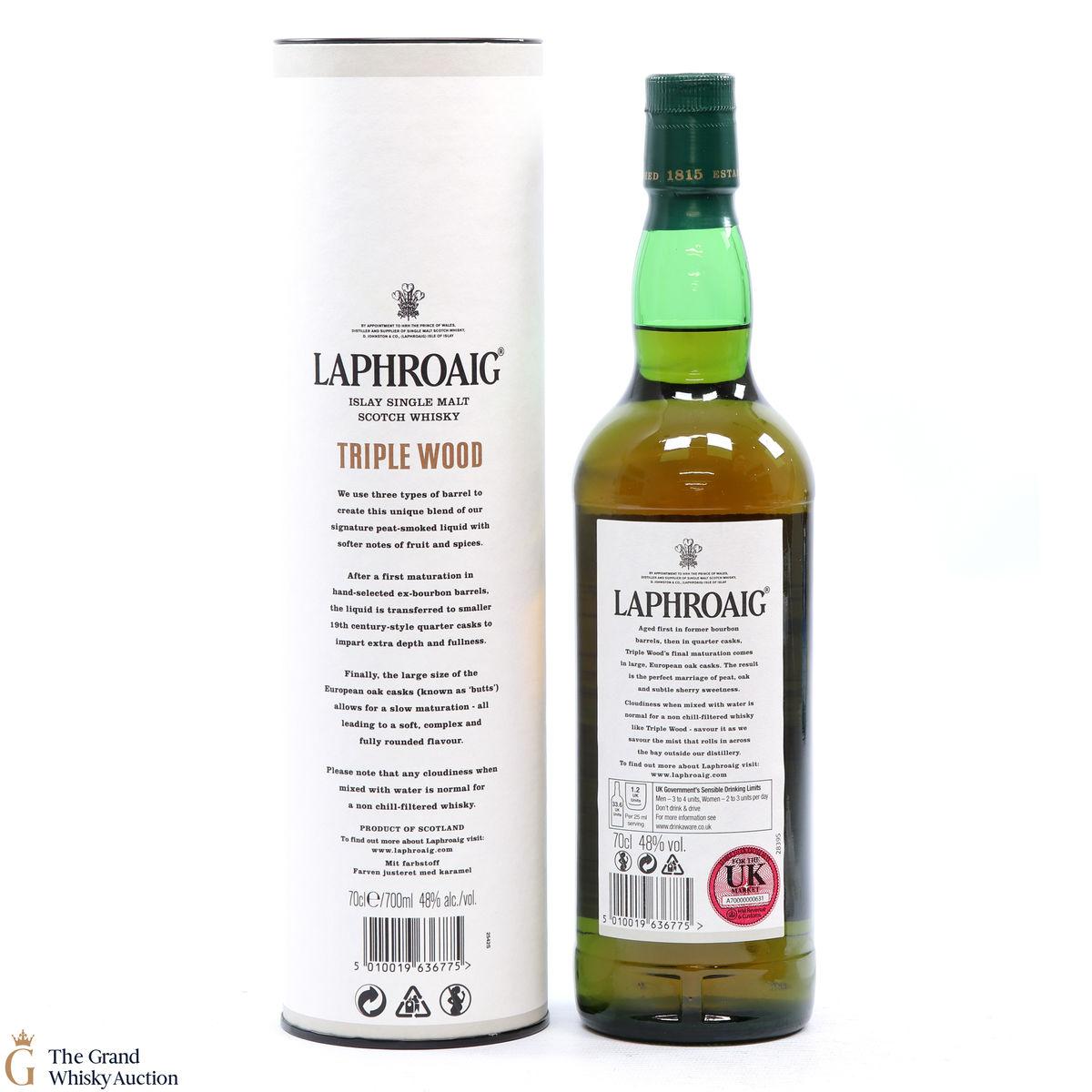 This is a 70 cl bottling of Laphroaig Triple wood. It was originally launched for the duty-free market but the Triple Wood has become a core expression from Laphroaig. The single malt has been triple matured; in bourbon barrels, quarter casks and then Oloroso sherry butts.