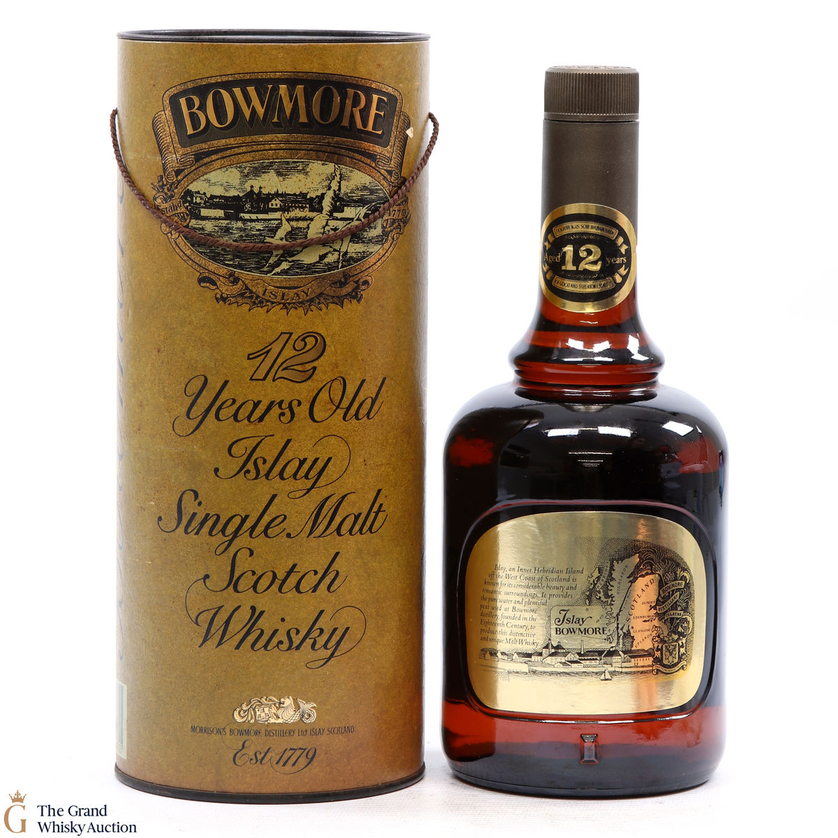 This is an iconic old dumpy style 75cl bottle of Bowmore 12-year-old Bowmore estimated to be from the 1980s. It was bottled when the distillery was Morrison's Bowmore before it was bought over by Suntory in 1989.