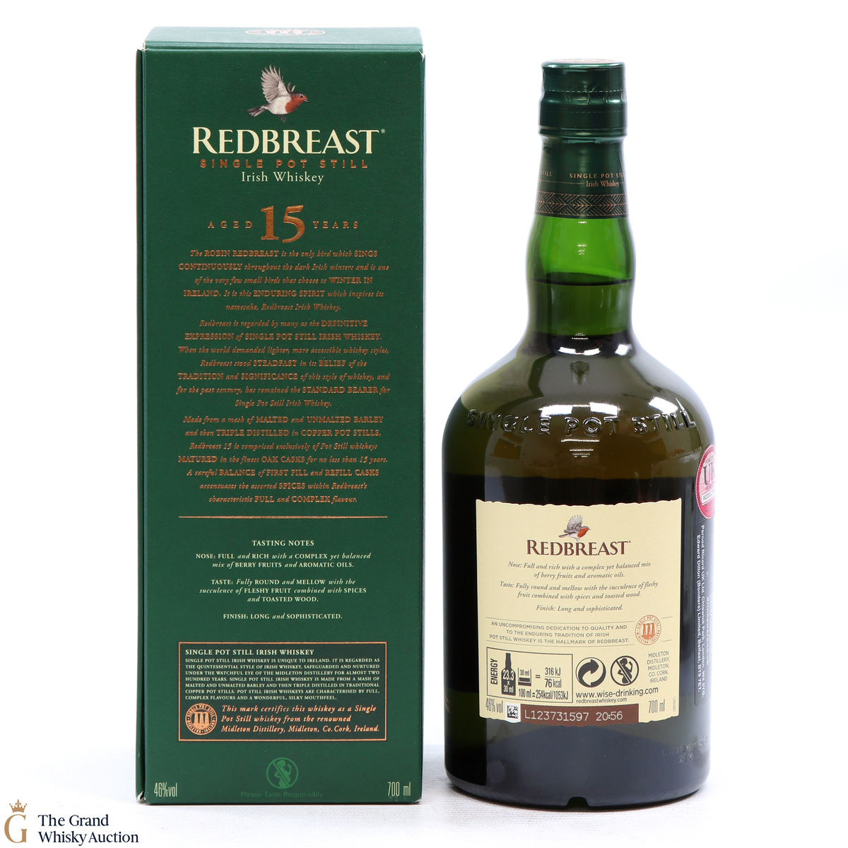 Redbreast is a single pot still whiskey distilled at New Midleton in Ireland using a combination of malted and un-malted barley. Triple distilled in copper pot stills. Redbreast 15 Year Old has won awards including a Gold Medal at the International Spirits Challenge 2010.
