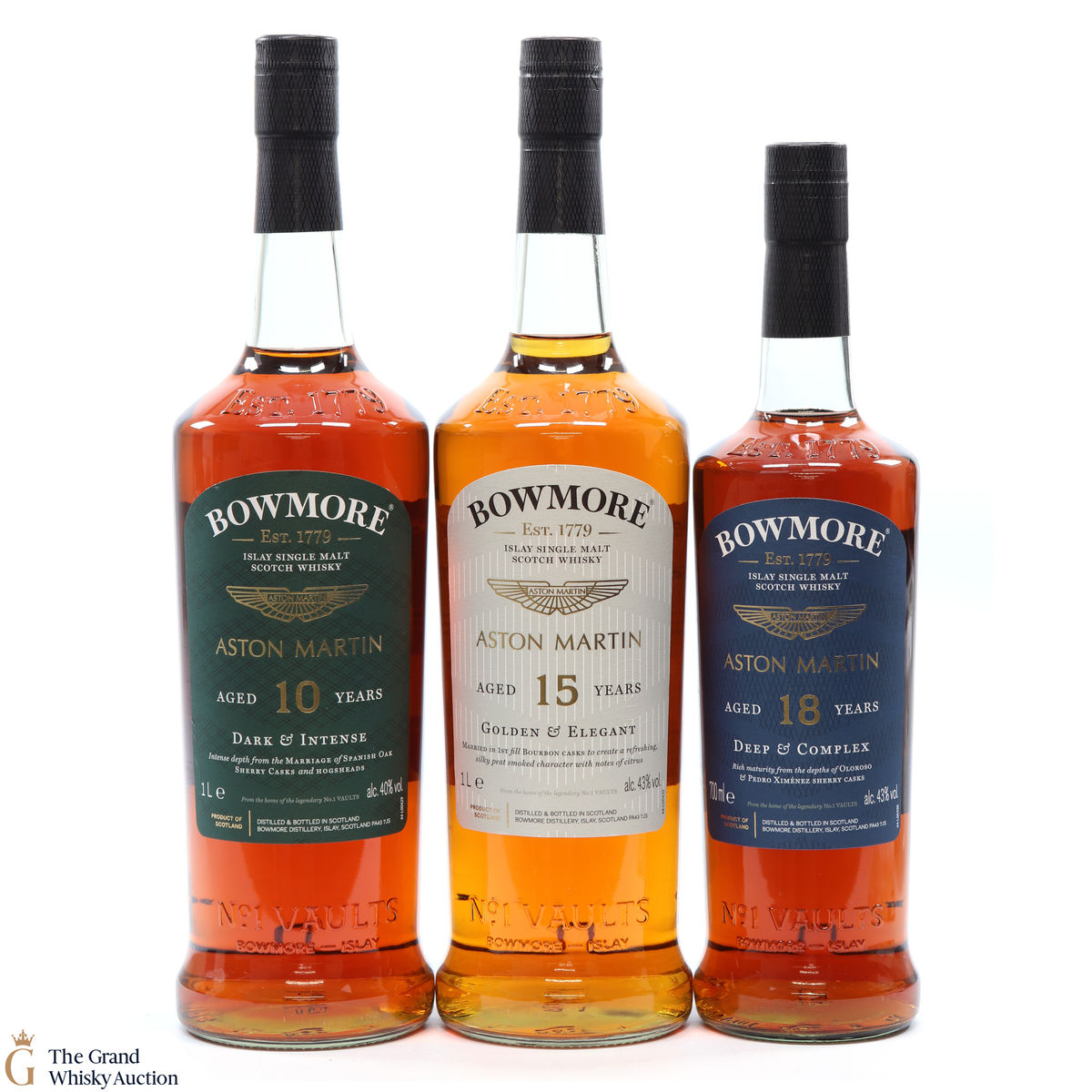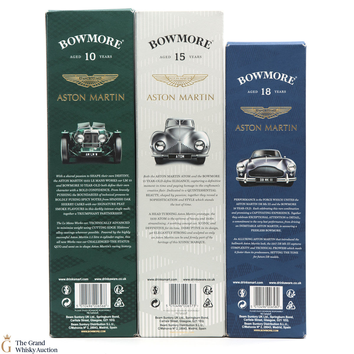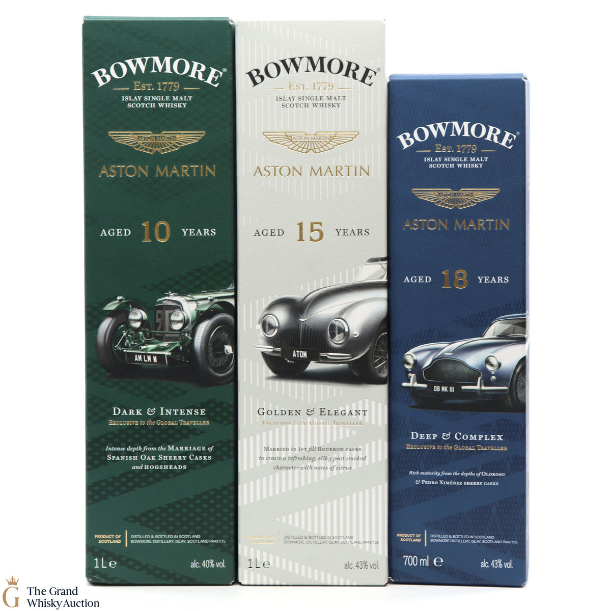 The full collection of the collaboration between Bowmore and Aston Martin, both creating timeless beauty and a lasting legacy. Each edition of the Aston Martin collection features a different car. Included in this lot is edition 1, 2 and 3: