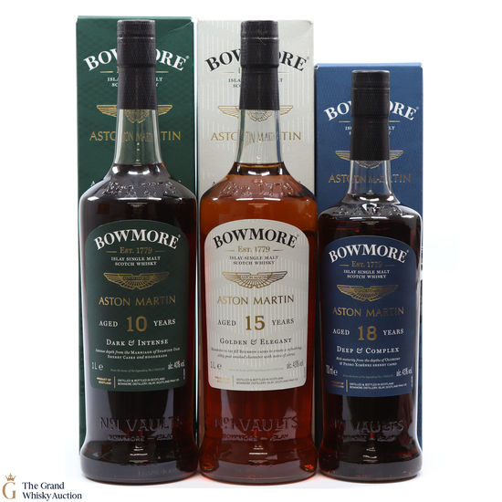 The full collection of the collaboration between Bowmore and Aston Martin, both creating timeless beauty and a lasting legacy. Each edition of the Aston Martin collection features a different car. Included in this lot is edition 1, 2 and 3: