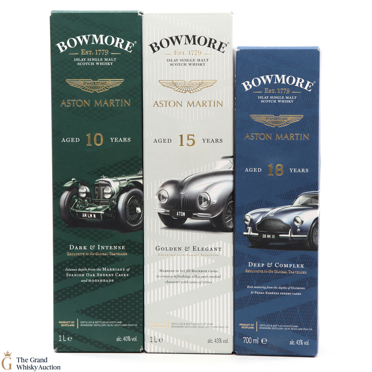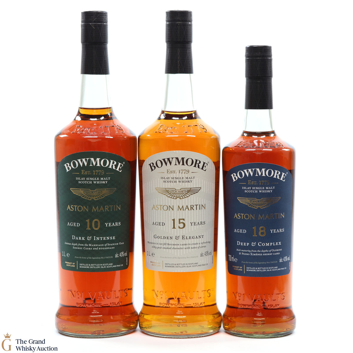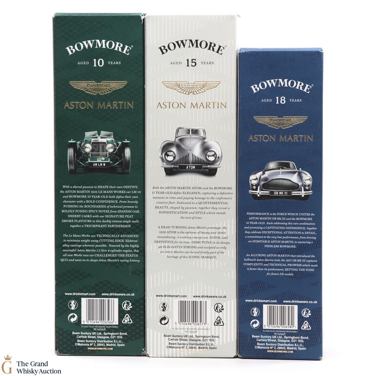 The full collection of the collaboration between Bowmore and Aston Martin, both creating timeless beauty and a lasting legacy. Each edition of the Aston Martin collection features a different car. Included in this lot is edition 1, 2 and 3:
