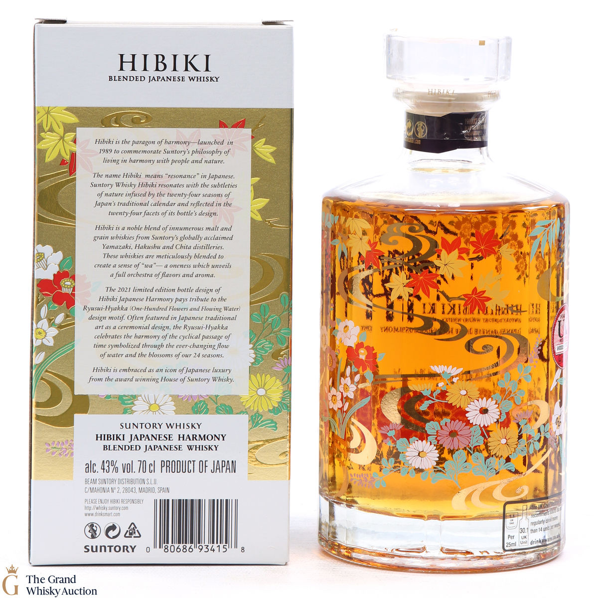 This is a limited edition, specially designed bottle with painted flowers and flowing ribbons of water. The 2021 special edition pays homage to the Ryisui-Hyakka (One Hundred Flowers and Flowing Water) and celebrates different seasonal flowers which help characterise the Japanese seasons. 5 types of casks were used and in typical Hibiki fashion, the bottle always has 24 facets which represent 24 seasons in the Japanese lunar calendar.