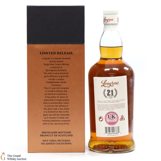 This 21-year-old Longrow, is a limited edition from Springbank Distillery in Campbeltown. This is one of only 3,600 bottles produced after maturation in 60% Sherry and 40% ex-Bourbon casks.