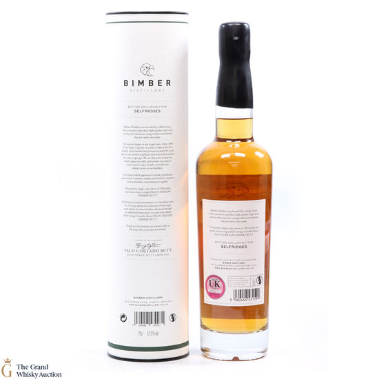 An exclusive partnership between the London distillery and department store Selfridges. This Bimber was made from single farm barley (which was malted at Westminster Maltings) and matured in a single Palo Cortado butt.
