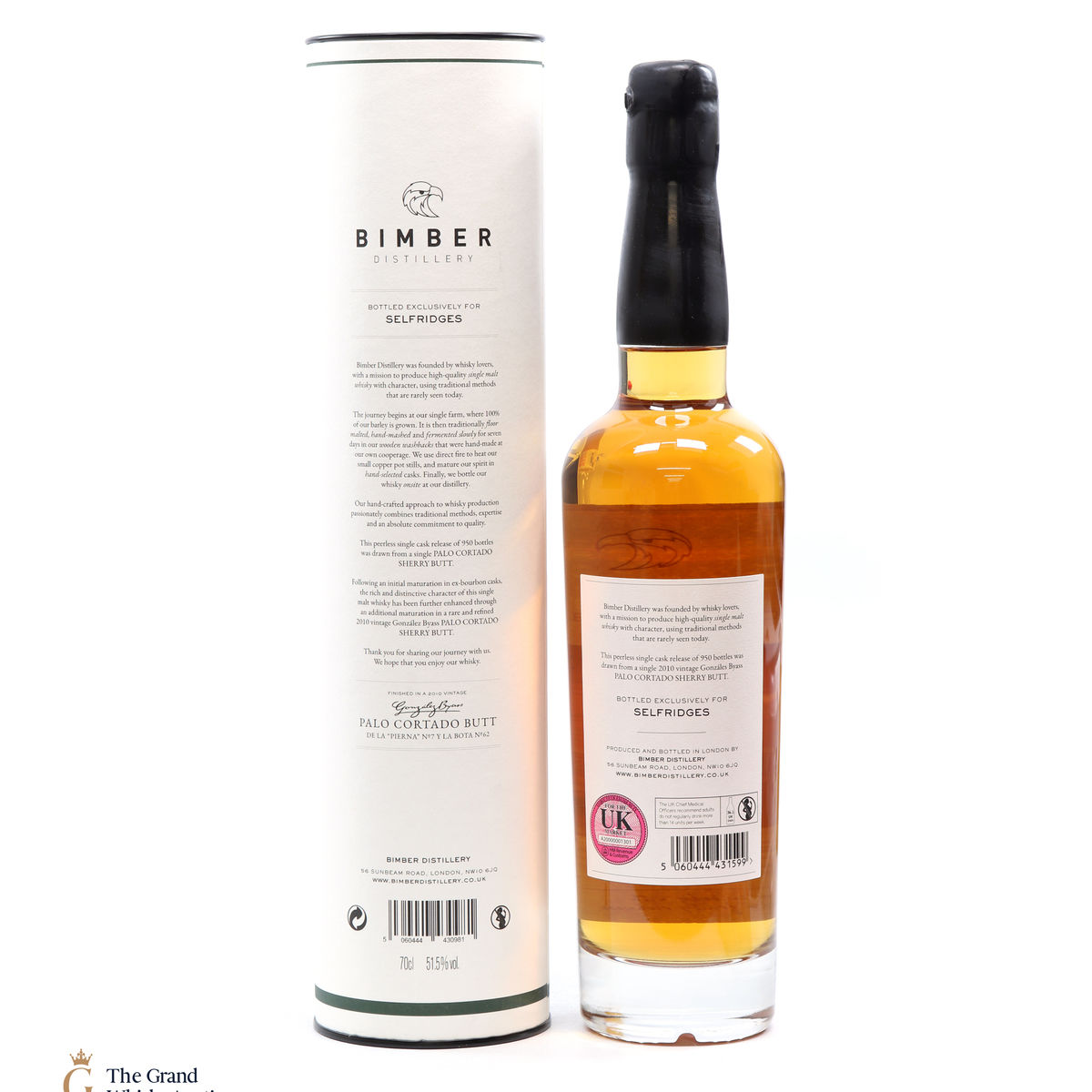 An exclusive partnership between the London distillery and department store Selfridges. This Bimber was made from single farm barley (which was malted at Westminster Maltings) and matured in a single Palo Cortado butt.