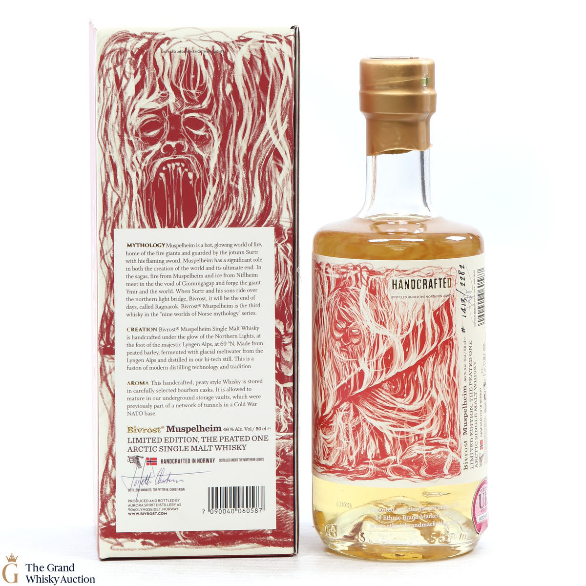 This is a limited edition bottle created in Arctic Norway was 'handcrafted under the Northern Lights'. This is a limited edition - The Peated One. Muspelheim is one of the Nine Worlds of Norse mythology - a hot and glowing land of fire, home to the fire giants and guarded by the jotunn Surtr with his flaming sword. This is a 50cl bottling.