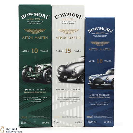 The full collection of the collaboration between Bowmore and Aston Martin, both creating timeless beauty and a lasting legacy. Each edition of the Aston Martin collection features a different car. Included in this lot is edition 1, 2 and 3: