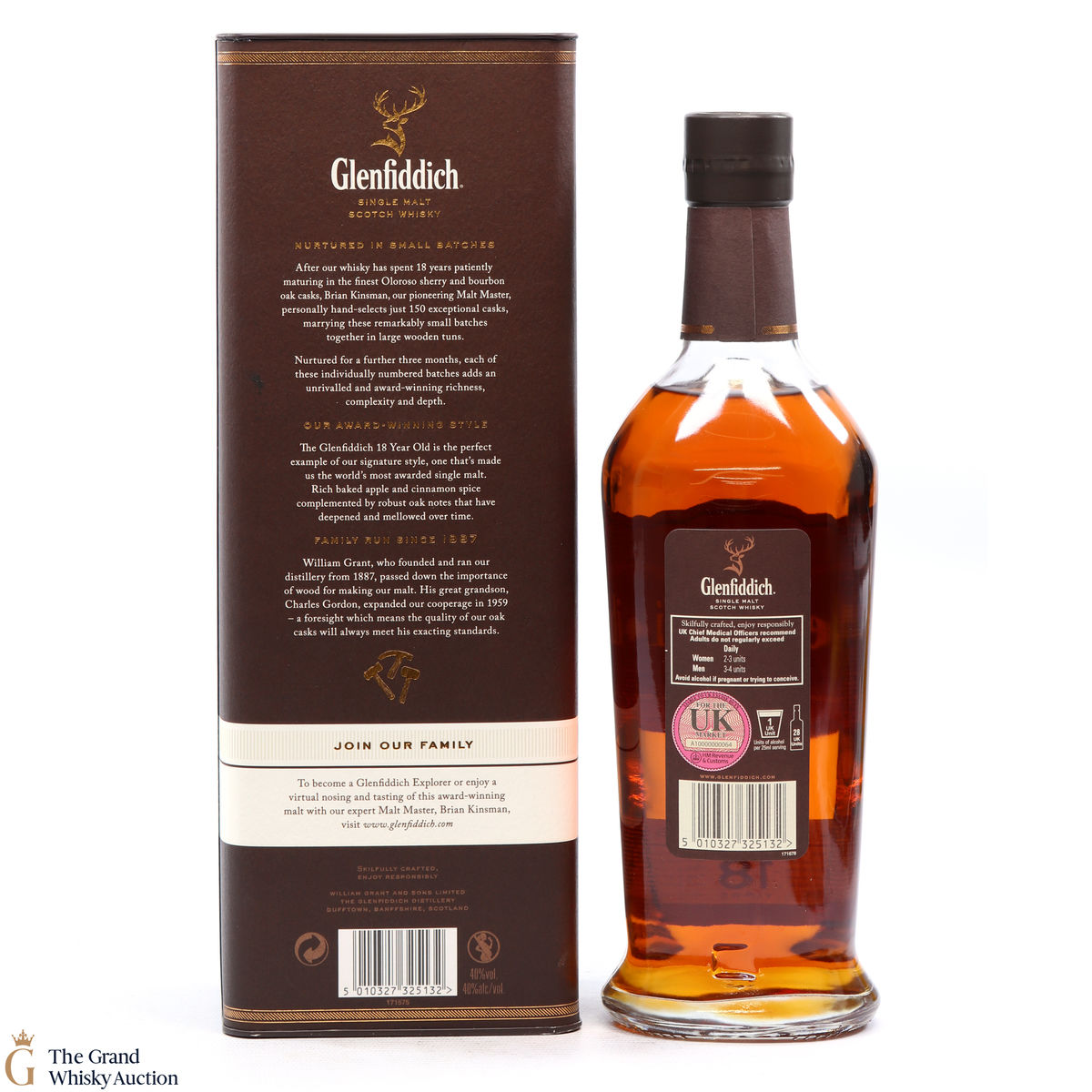 Matured in small batches the Glenfiddich 18 is arguably the most complex in the core range. The single malt has been matured in oloroso sherry and bourbon casks. It is very fragrant with tropical fruit and sherry cask influences, rich baked apple and cinnamon spice compliments by robust oak notes.