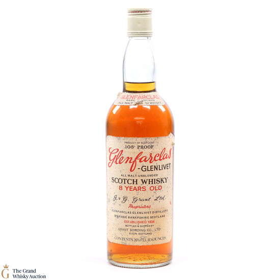 A 26 & 2/3 (75cl) bottling of Glenfarclas-Glenlivet 8 Year Old All Malt Unblended Scotch Whisky from around the 1970/80s. Bonded and bottled by Grant Bonding Co. Ltd at 105 proof.