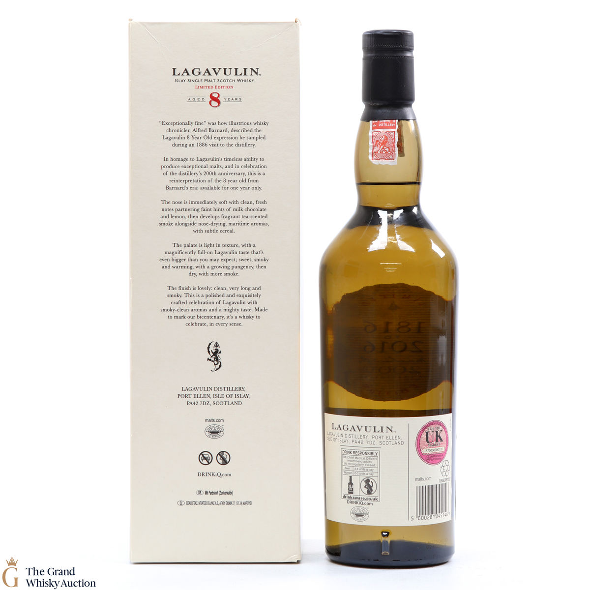 This 8 year old was released in 2016 to commemorate the 200th anniversary of the founding of Lagavulin distillery by John Johnston in 1816. This single malt is smoky, with underlying sweet spice. It was inspired by the visit of Alfred Barnard to the distillery in the 1880s when he tried an 'exceptionally fine' eight-year-old from the distillery, making this a very fitting tribute for the milestone occasion.