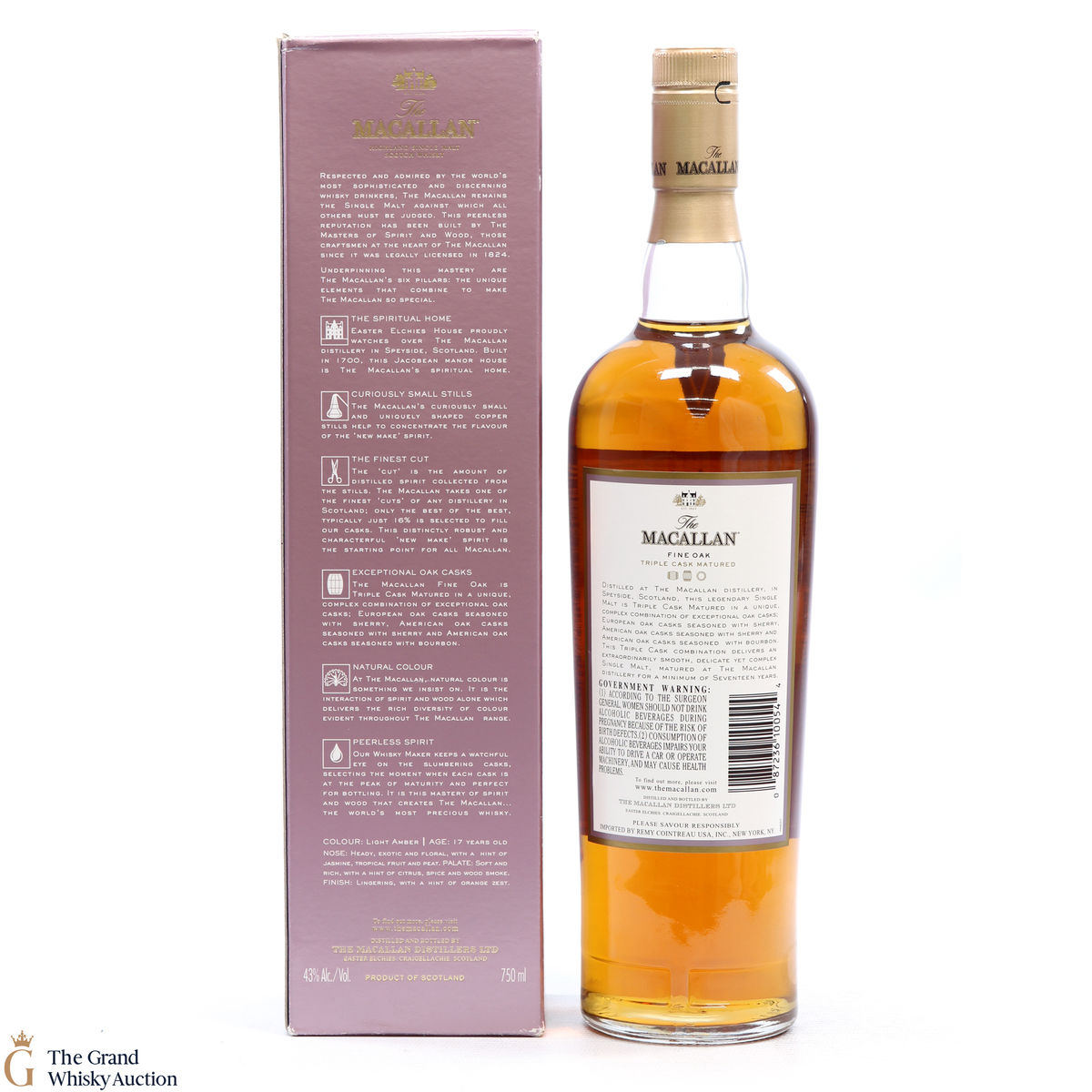 The Macallan Fine Oak 17 Years Old is part of the Macallan Fine Oak range. It has been matured for a minimum of seventeen years in three oak cask types including American and European ex-oloroso sherry and American oak bourbon casks. It was introduced to the US market in 2006.