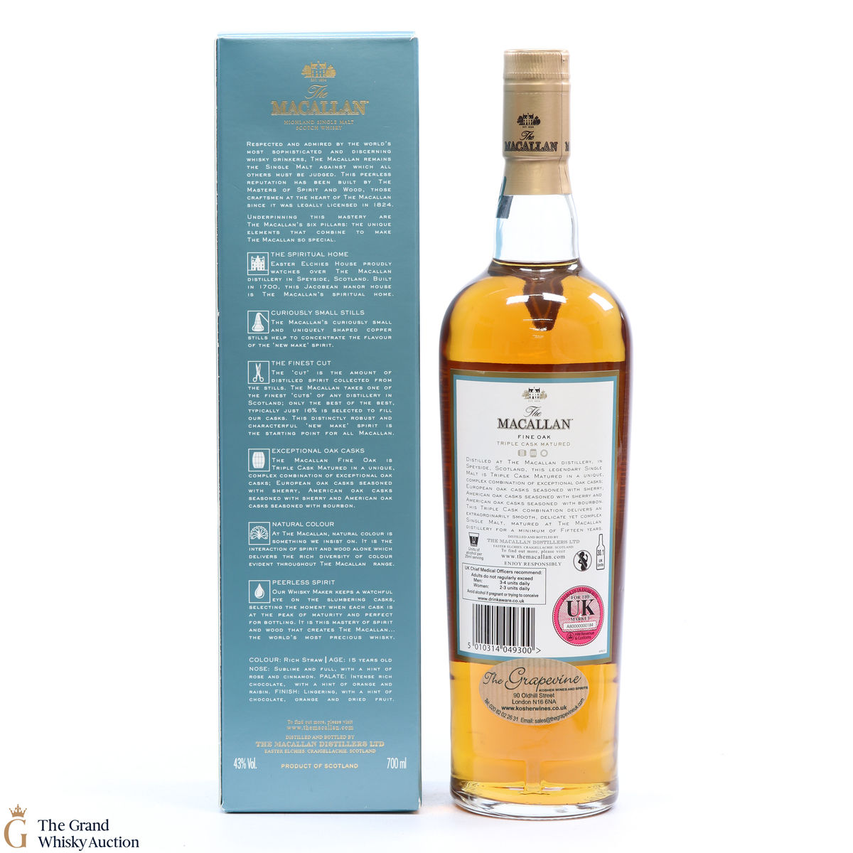 This 15 year old single malt is part of Macallan's Fine Oak, triple cask matured range. It has been matured for fifteen years in three oak cask types; Europen oak seasoned with sherry, American oak seasoned with sherry and American oak seasoned with bourbon. It is 'a rich straw whisky' with notes of cinnamon, rich chocolate and dried fruits. This bottle is an import.