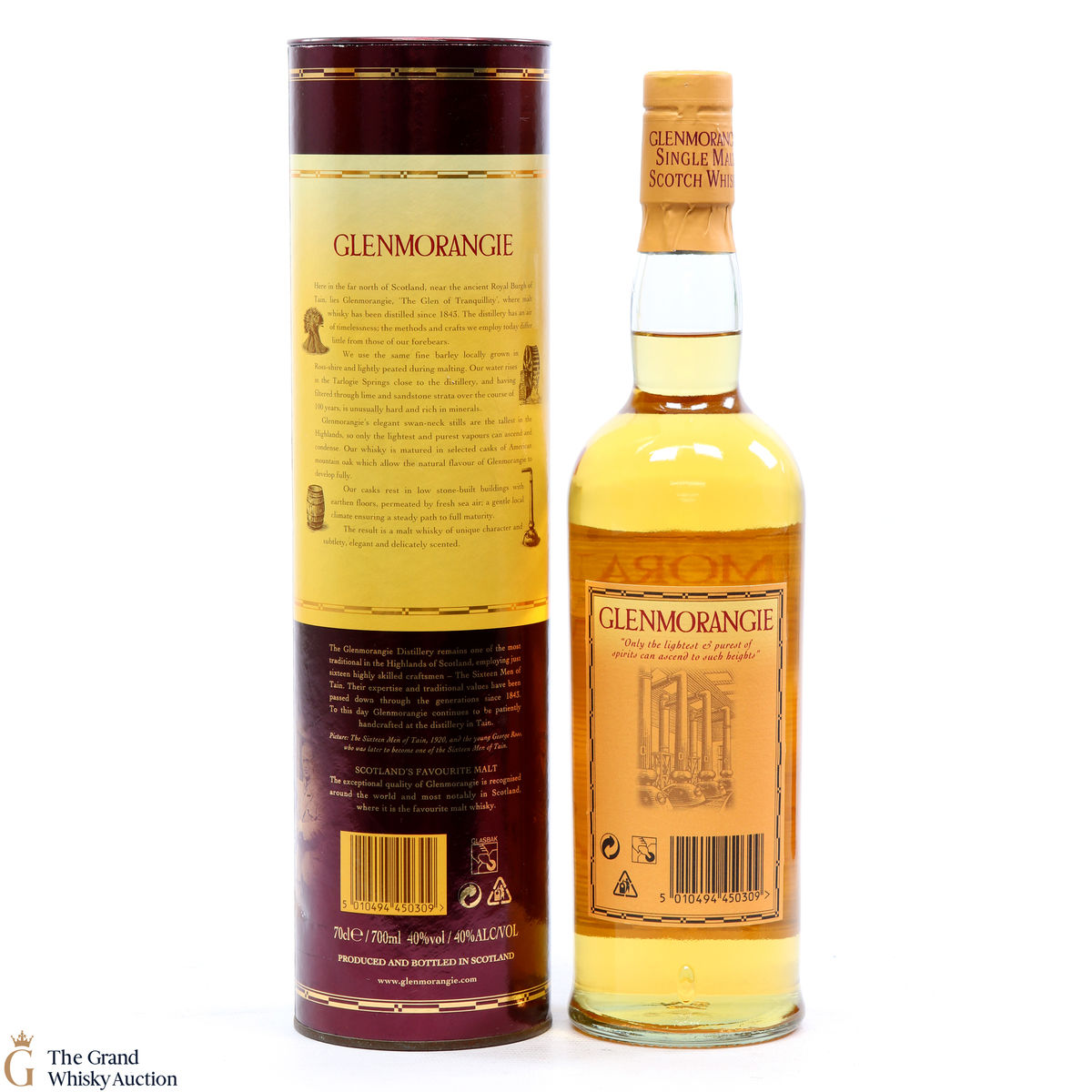 An older style bottling of Glenmorangie 10-year-old. Handcrafted by the sixteen men of Tain.